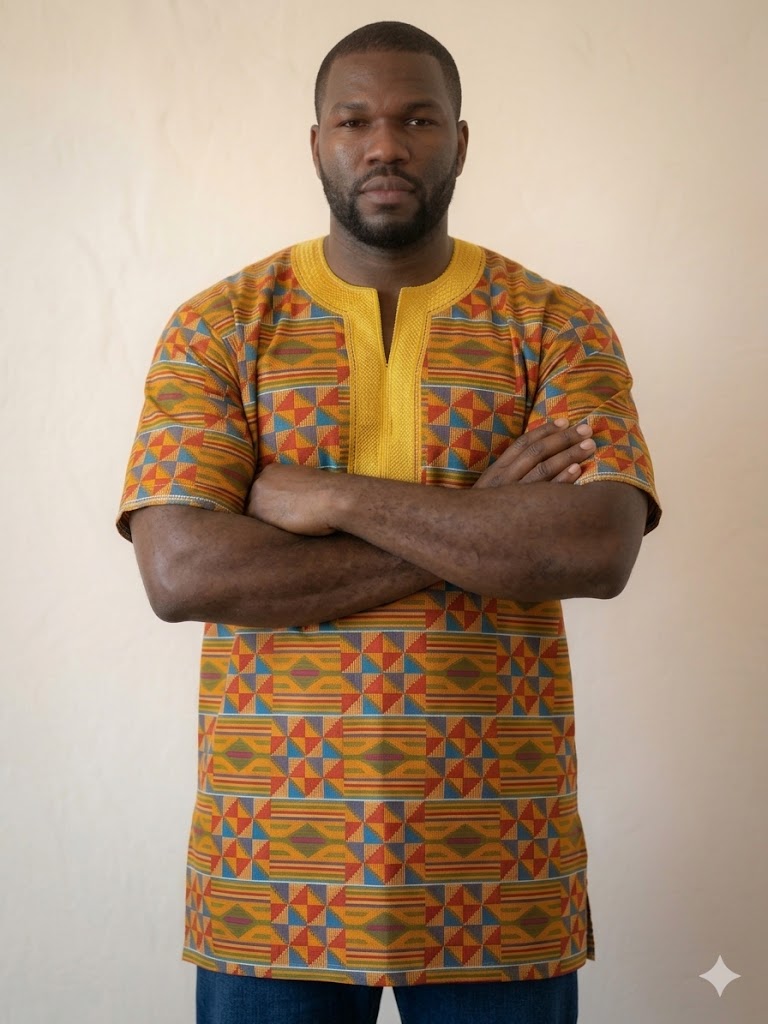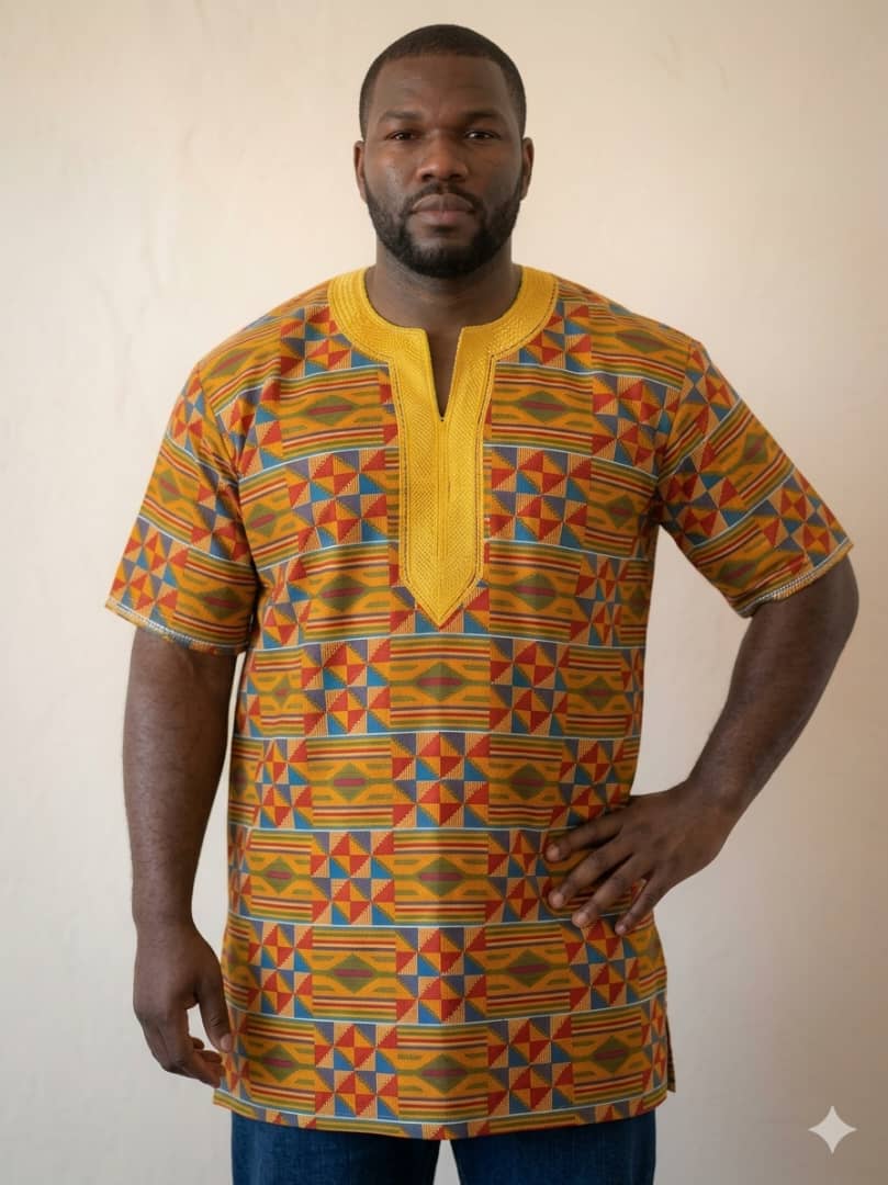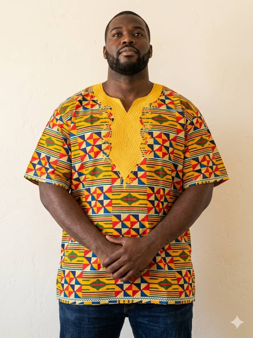 The Kente Print Kaftan Dashiki Top is a handmade cotton garment from Ghana, featuring a vibrant multi-color Kente print. This kaftan-style top is designed for men and showcases traditional African-inspired patterns, making it a unique and stylish addition to any wardrobe. Perfect for those looking to add a touch of cultural flair to their outfit, this piece embodies a blend of African and Indian craftsmanship.