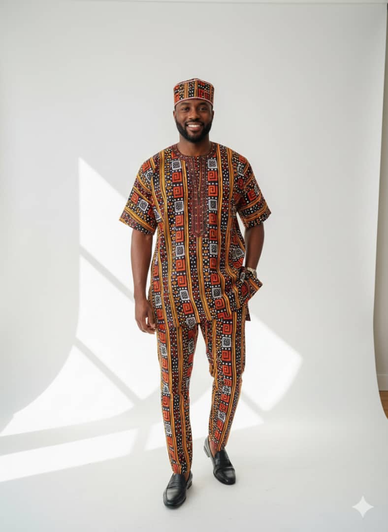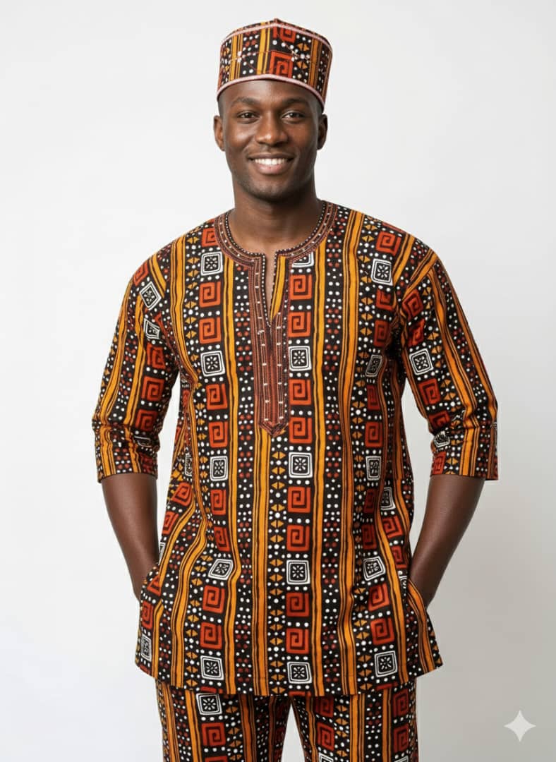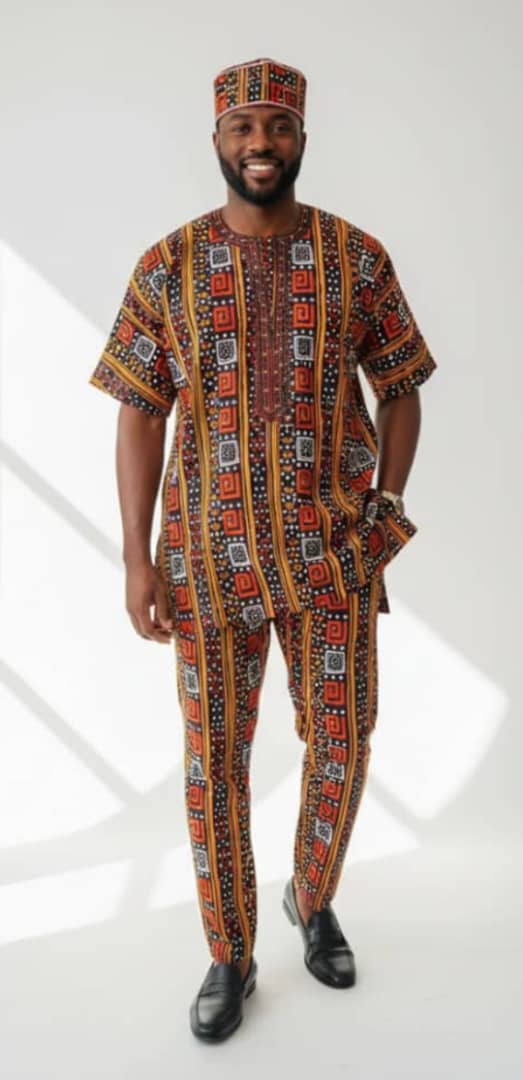 This Men’s African High Quality Cotton Ghana Ankara Dashiki Set with Cap is a handmade garment made from cotton, specifically from Nigeria. The traditional style of the dashiki is reflected in the brown color and XL size, catering to men who appreciate cultural clothing. The set includes a cap to complete the look, making it a complete ensemble for any special occasion. The craftsmanship and high-quality material make this a standout piece for those who value unique and authentic attire.
