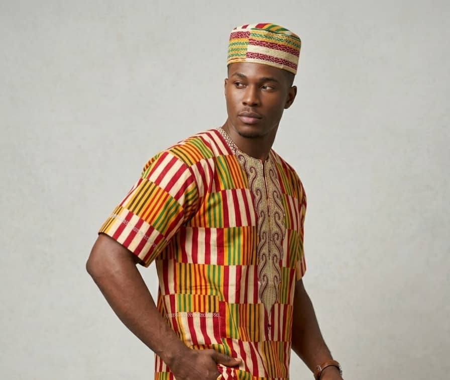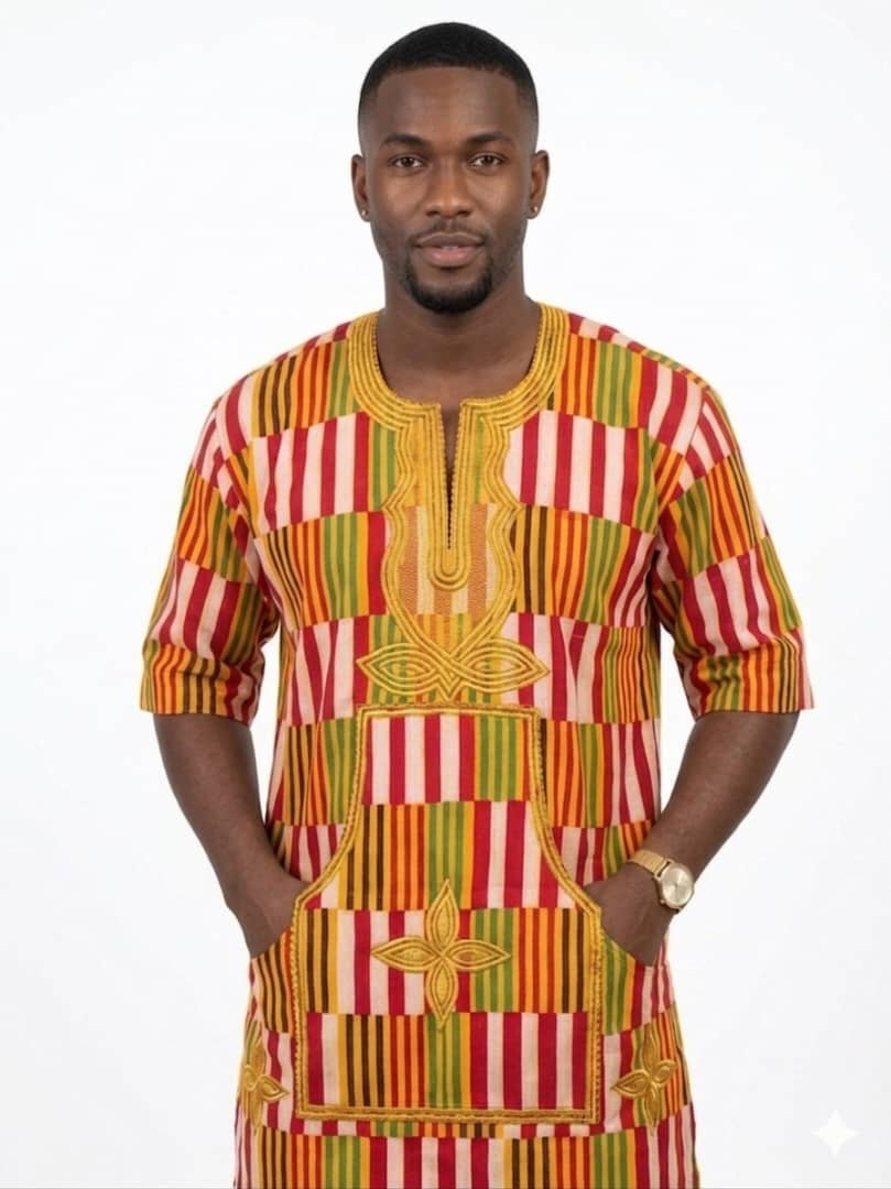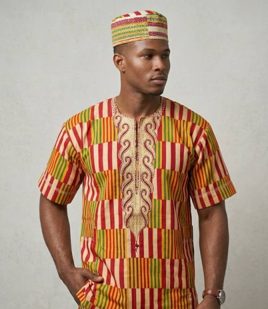 Men’s lightweight Kente Print Kaftan/Dashiki With Kufi Cap.