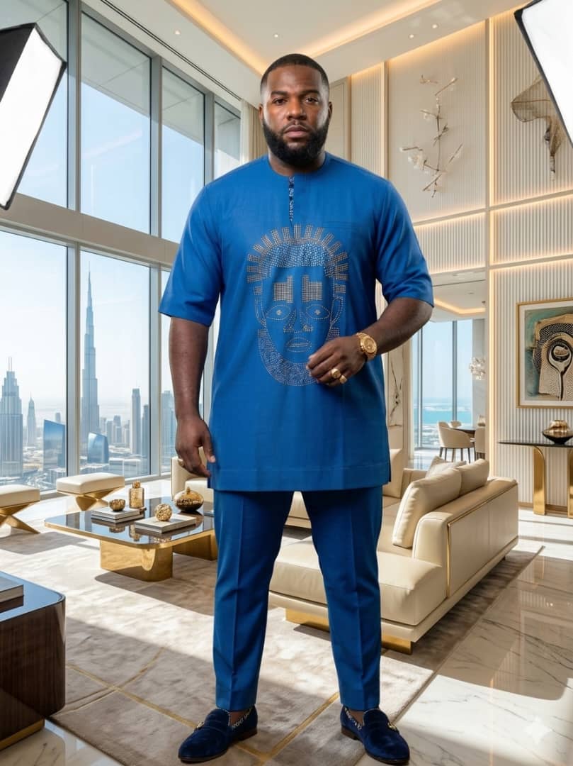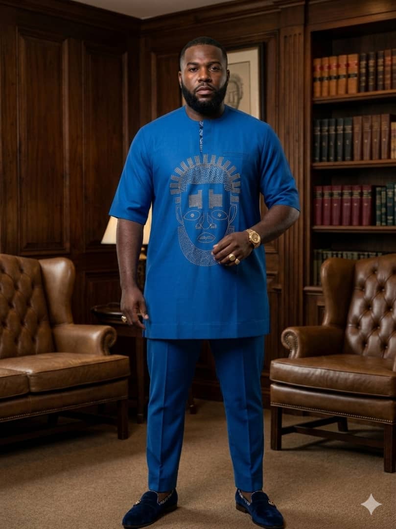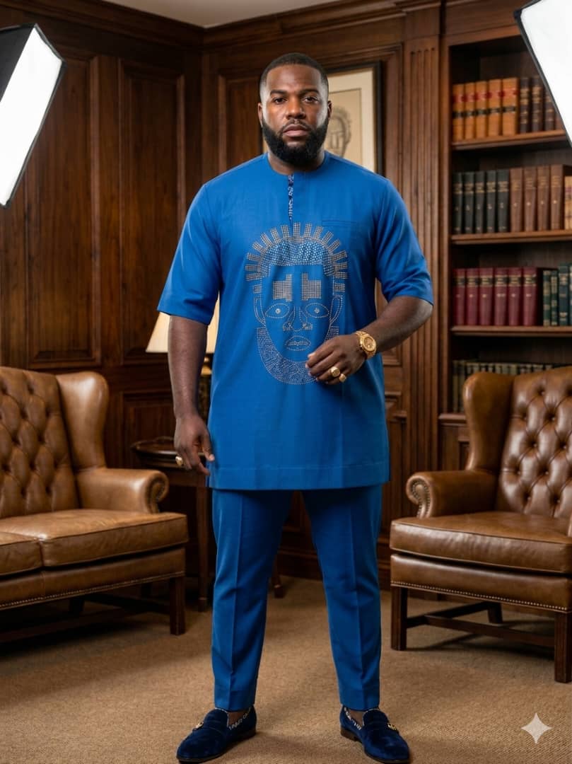 This striking 2-piece set showcases a dazzling crystal‑embellished portrait inspired by Queen Idia of the historic Benin Kingdom in Nigeria. The design captures her iconic ivory mask, a symbol of strength, leadership, and cultural prestige, rendered in shimmering stones that catch the light with every movement. Set against a rich, modern silhouette, the crystal artwork blends traditional Benin artistry with contemporary fashion flair. Crafted for those who appreciate heritage and bold style, it transforms a legendary cultural icon into wearable art. Whether worn casually or as a statement piece, it radiates elegance, pride, and a deep connection to African history. Size is XL in blue. It is specifically designed for men. This outfit exudes a sense of top-class elegance and sophistication, perfect for any special occasion or cultural event where one wishes to showcase their unique sense of style.